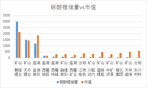 事实上,如果将A股所有的有锂矿的上市公司按市值和储量排列,我们会发现一个近乎于作弊的公式:碳酸锂储量越小的公司相对市值反而越高。