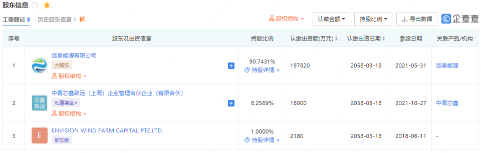 公告显示,项目装机总容量40万千瓦,配套建设箱变、集电线路、道路及相关配套设施。同时配置40万KWh电化学储能系统。公告提出,投标人应具有类似工程施工总承包经验或EPC总承包经验(至少3个类似风电场施工总承包/EPC总承包工程业绩)。据了解,景泰新能源(上海)有限公司成立于2018年,经营范围包含风电场相关系统研发,风电、水电、太阳能发电项目的开发等。该公司由远景能源持股90.7431%。