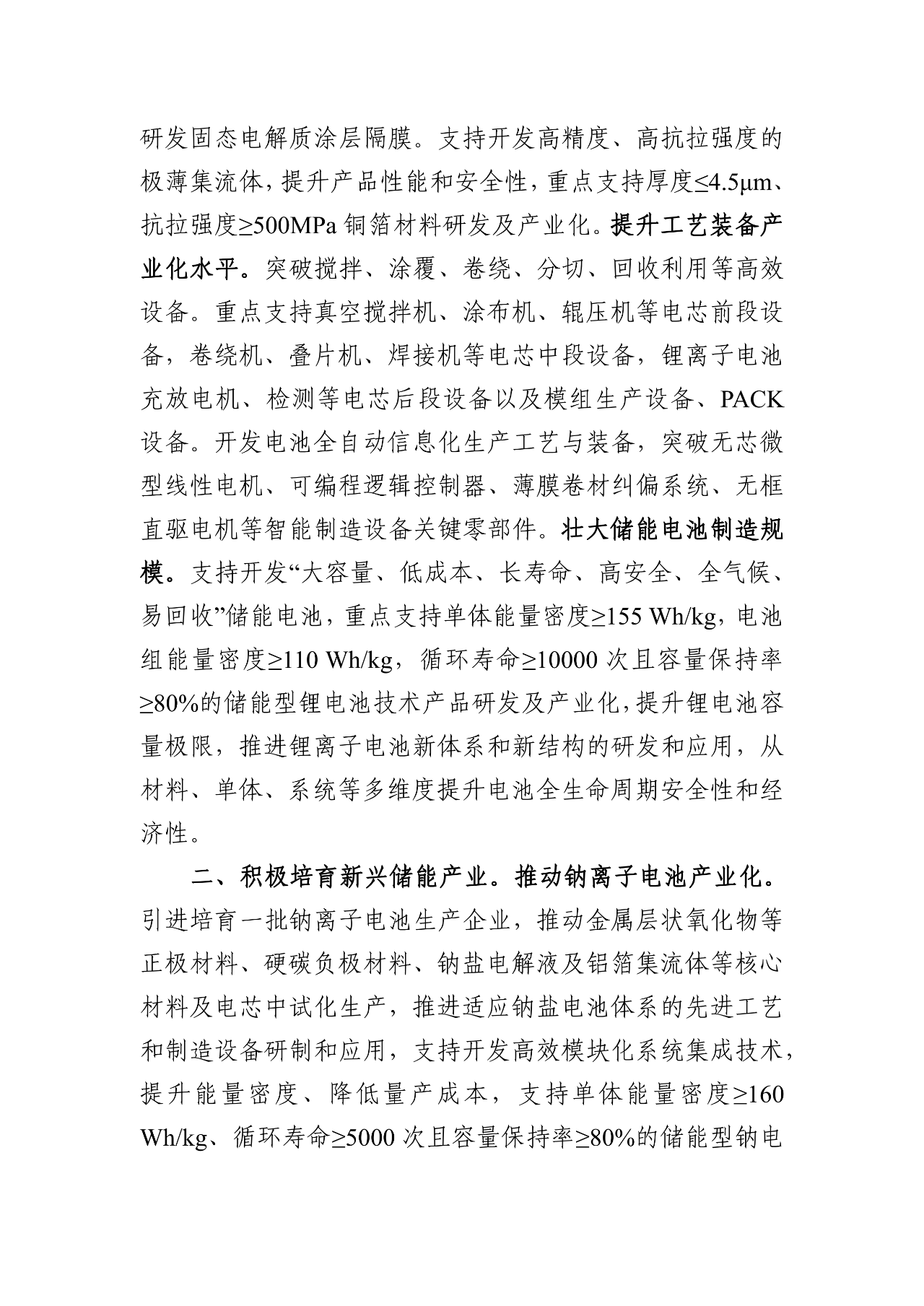 壮大储能电池制造规模。支持开发“大容量、低成本、长寿命、高安全、全气候、易回收”储能电池,重点支持单体能量密度≥155Wh/kg,电池组能量密度≥110Wh/kg,循环寿命≥10000次且容量保持率≥80%的储能型锂电池技术产品研发及产业化,提升锂电池容量极限。