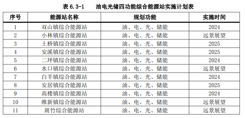 “十四五”期间,在现有乡镇 20 座加油站择优选取有条件的9 座加油站内新增充电、光伏功能,另鼓励在站内设置储能设施。