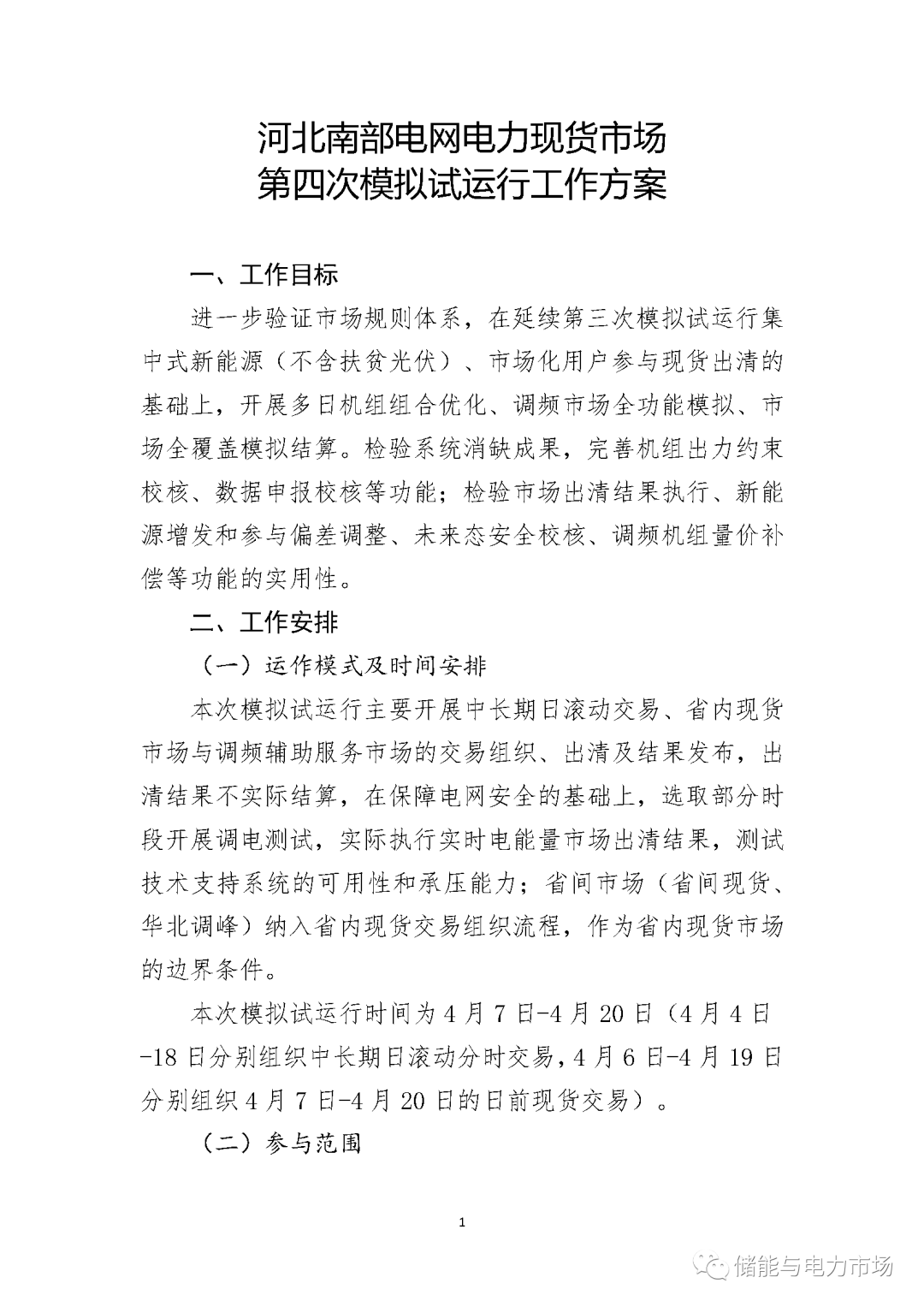 《河北南部电网电力现货市场第四次模拟试运行工作方案》如下: