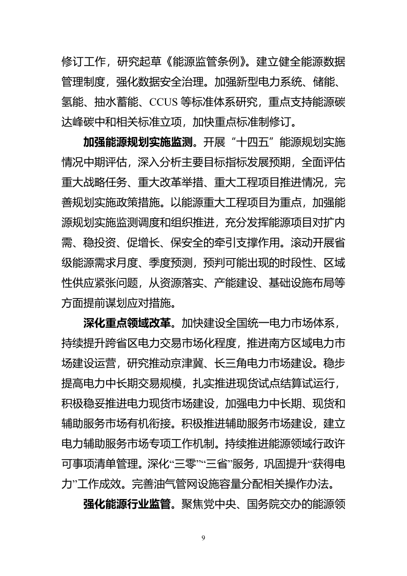 深化重点领域改革。加快建设全国统一电力市场体系,持续提升跨省区电力交易市场化程度,推进南方区域电力市场建设运营,研究推动京津冀、长三角电力市场建设。稳步提高电力中长期交易规模,扎实推进现货试点结算试运行,积极稳妥推进电力现货市场建设,加强电力中长期、现货和辅助服务市场有机衔接。积极推进辅助服务市场建设,建立电力辅助服务市场专项工作机制。持续推进能源领域行政许可事项清单管理。深化“三零”“三省”服务,巩固提升“获得电力”工作成效。完善油气管网设施容量分配相关操作办法。