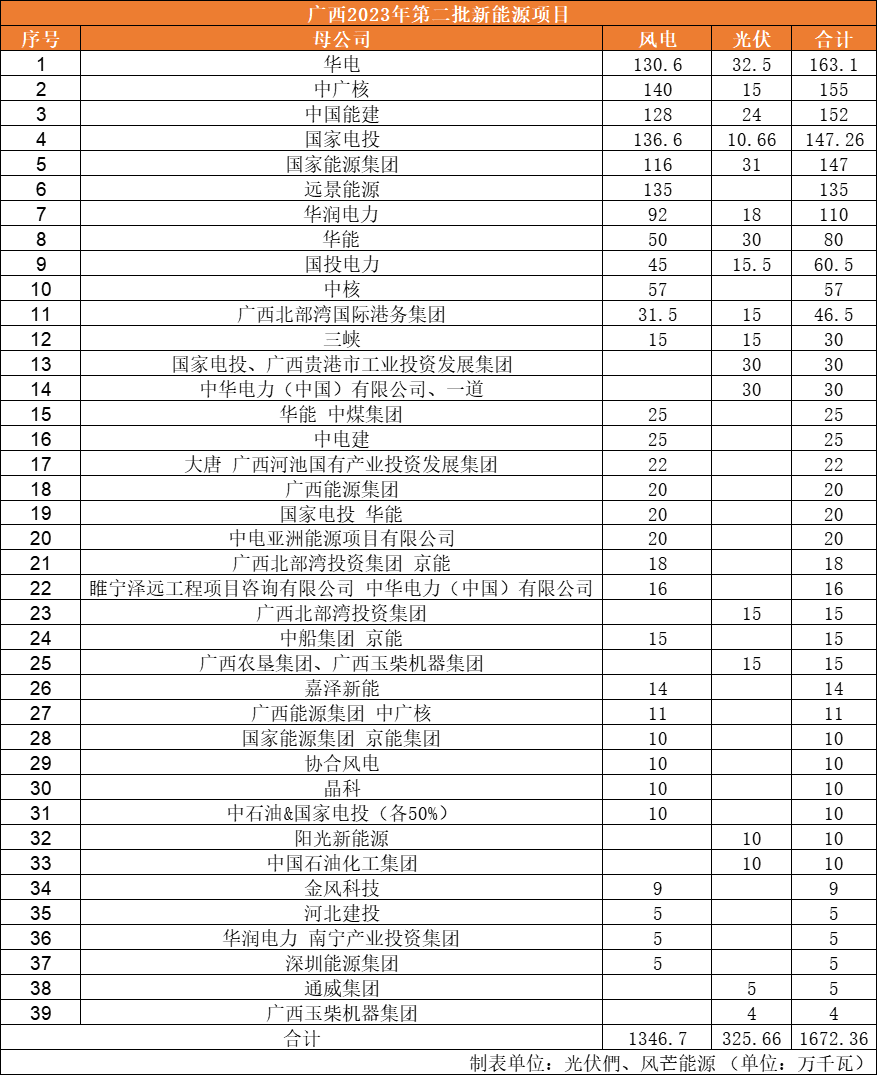 通知显示,广西此次列入2023年第二批新能源项目建设方案的项目共138个,装机容量约1672万千瓦。其中,陆上风电项目109个,装机容量约1347万千瓦,集中式光伏发电项目29个,装机容量约326万千瓦。
