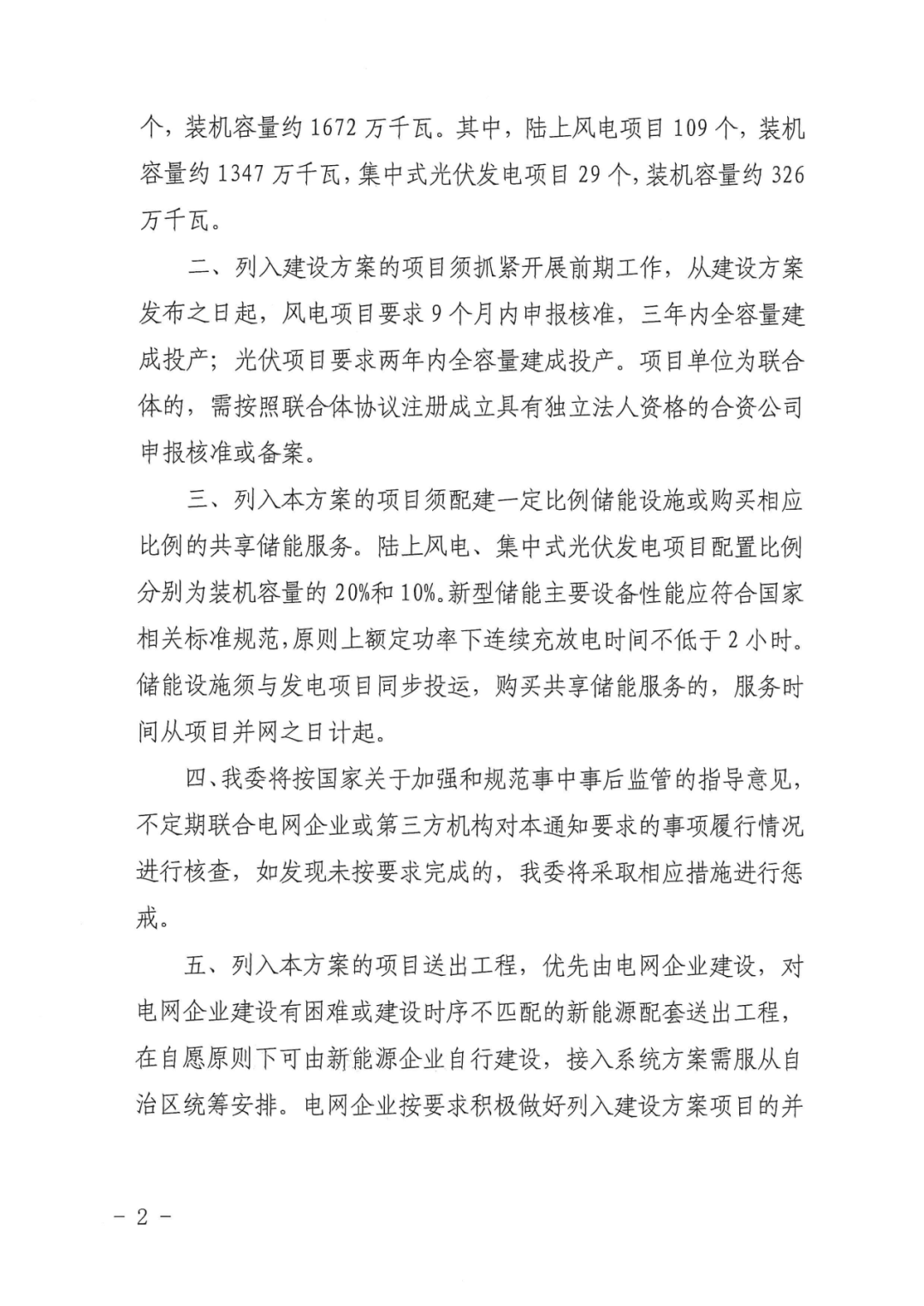 对于第二批项目,通知显示列入建设方案的项目须抓紧开展前期工作,从建设方案发布之日起,风电项目要求9个月内申报核准,三年内全容量建成投产;光伏项目要求两年内全容量建成投产。项目单位为联合体的,需按照联合体协议注册成立具有独立法人资格的合资公司申报核准或备案。